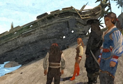 Пираты на берегу около остова разбившегося корабля.